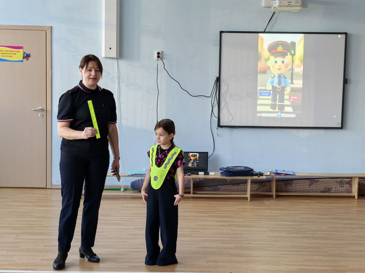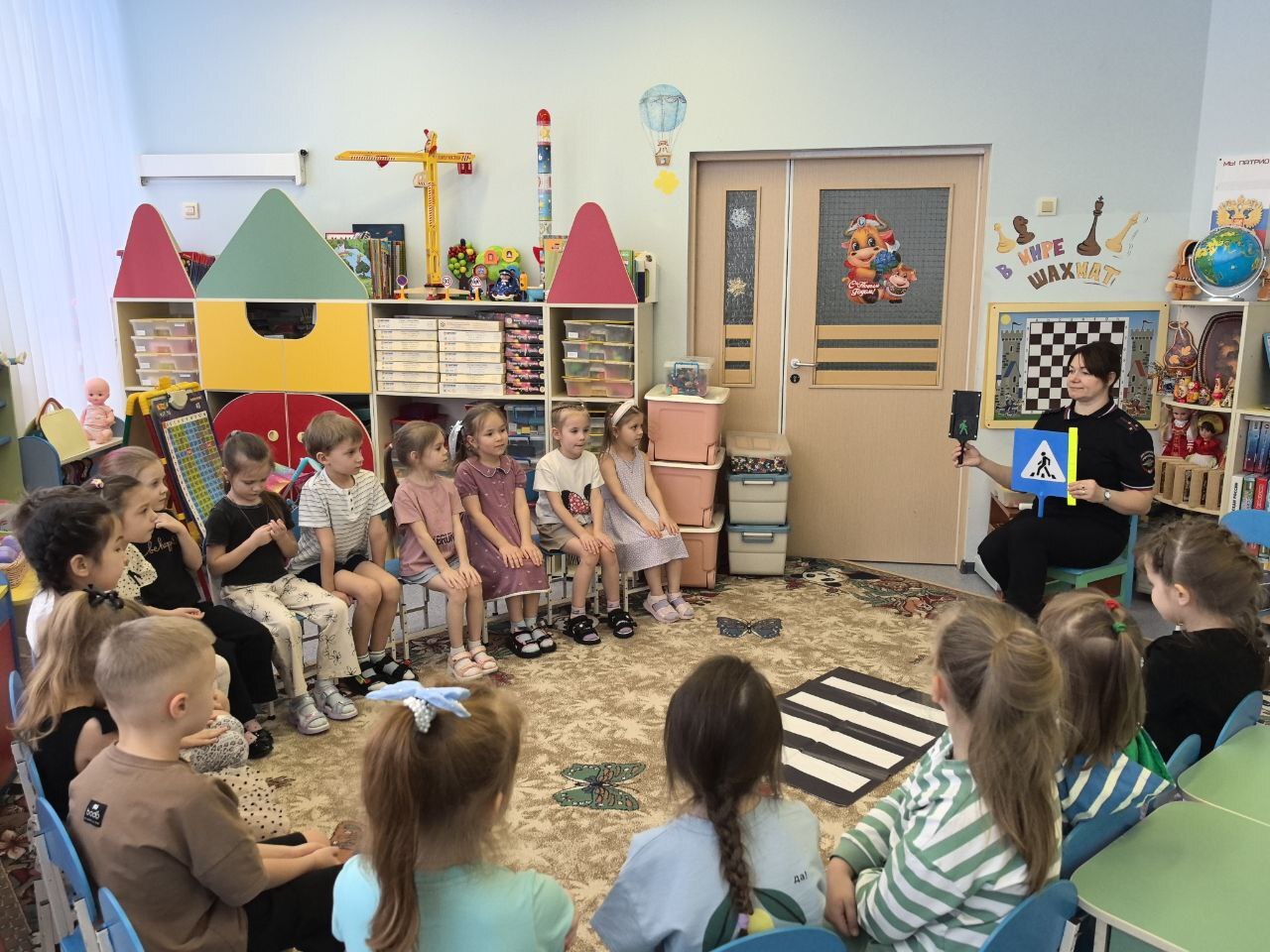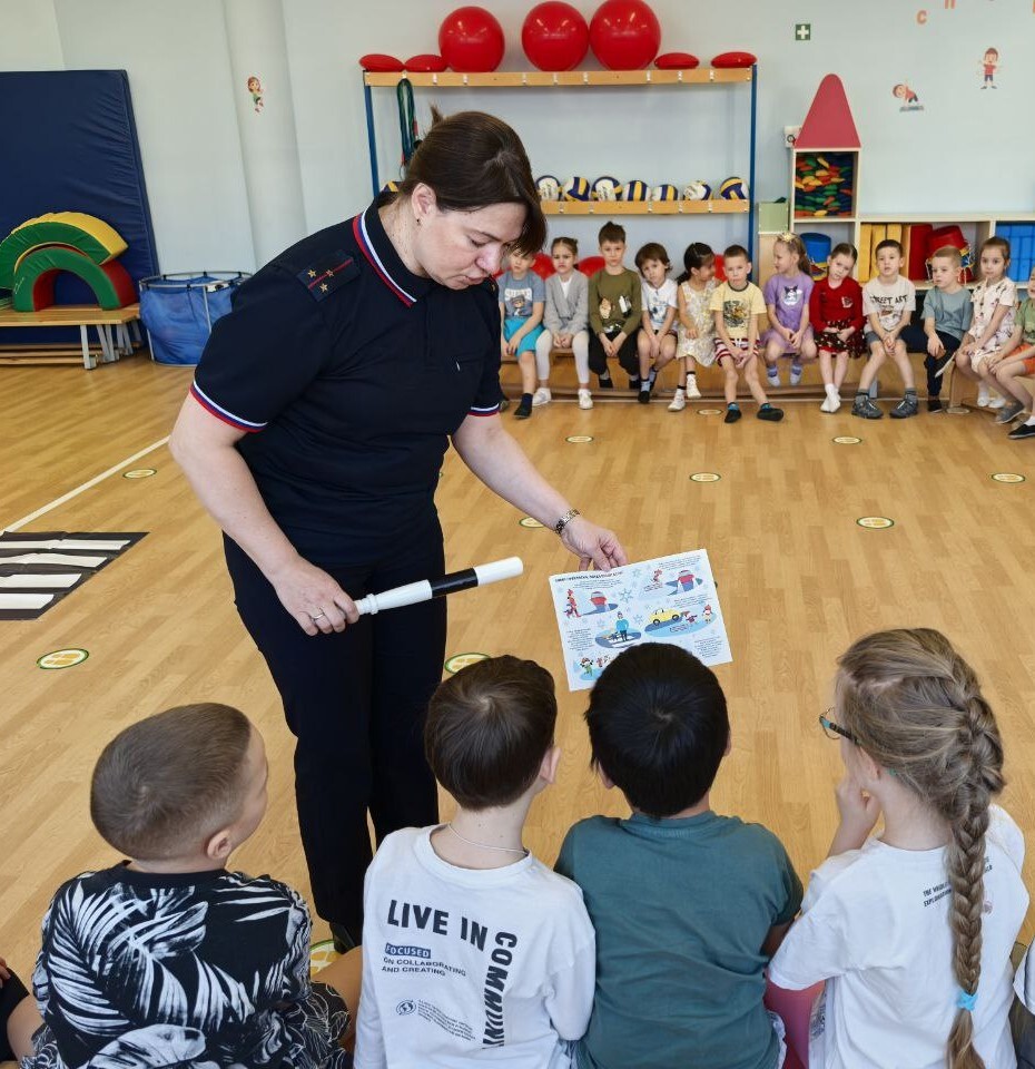 Вместе с инспектором ребята вспомнили основные правила безопасного поведения на дороге, правила перевозки детей в автомобиле, сигналы светофора, дорожные знаки, поговорили о роли светоотражающих элементов на одежде.